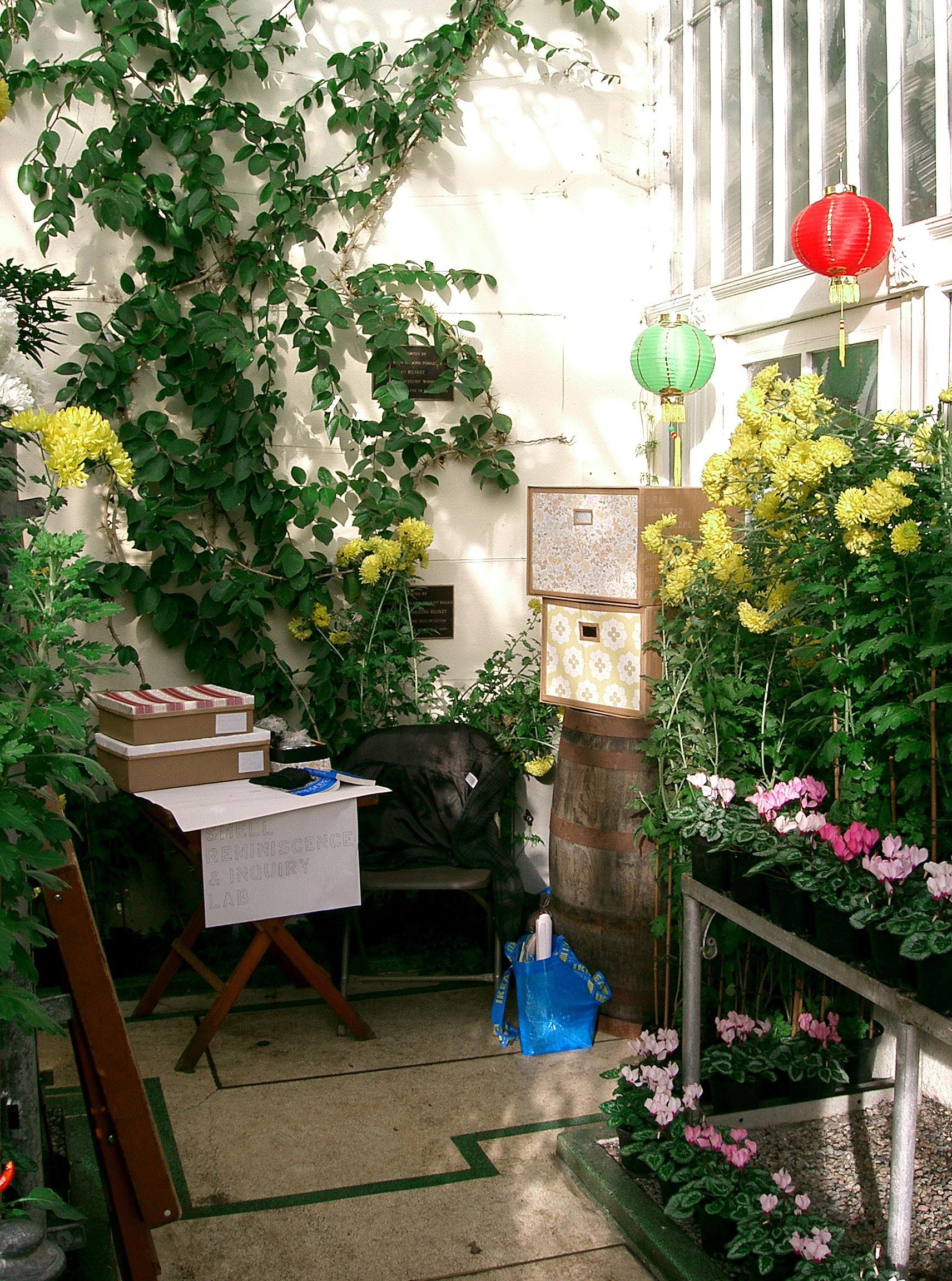 I invited people to make a personal history in terms of smell, using an archive of smells I had collected from previous projects. The archive included things such as tobacco, talc, herbs, pencil sharpenings and cleaning products. This was located in The Botanic Gardens Belfast (as seen) and in a second hand bookshop/cafe for 9 weeks. People were asked to say what smells they associated with childhood, home, grandparents, being a teenager, school etc.