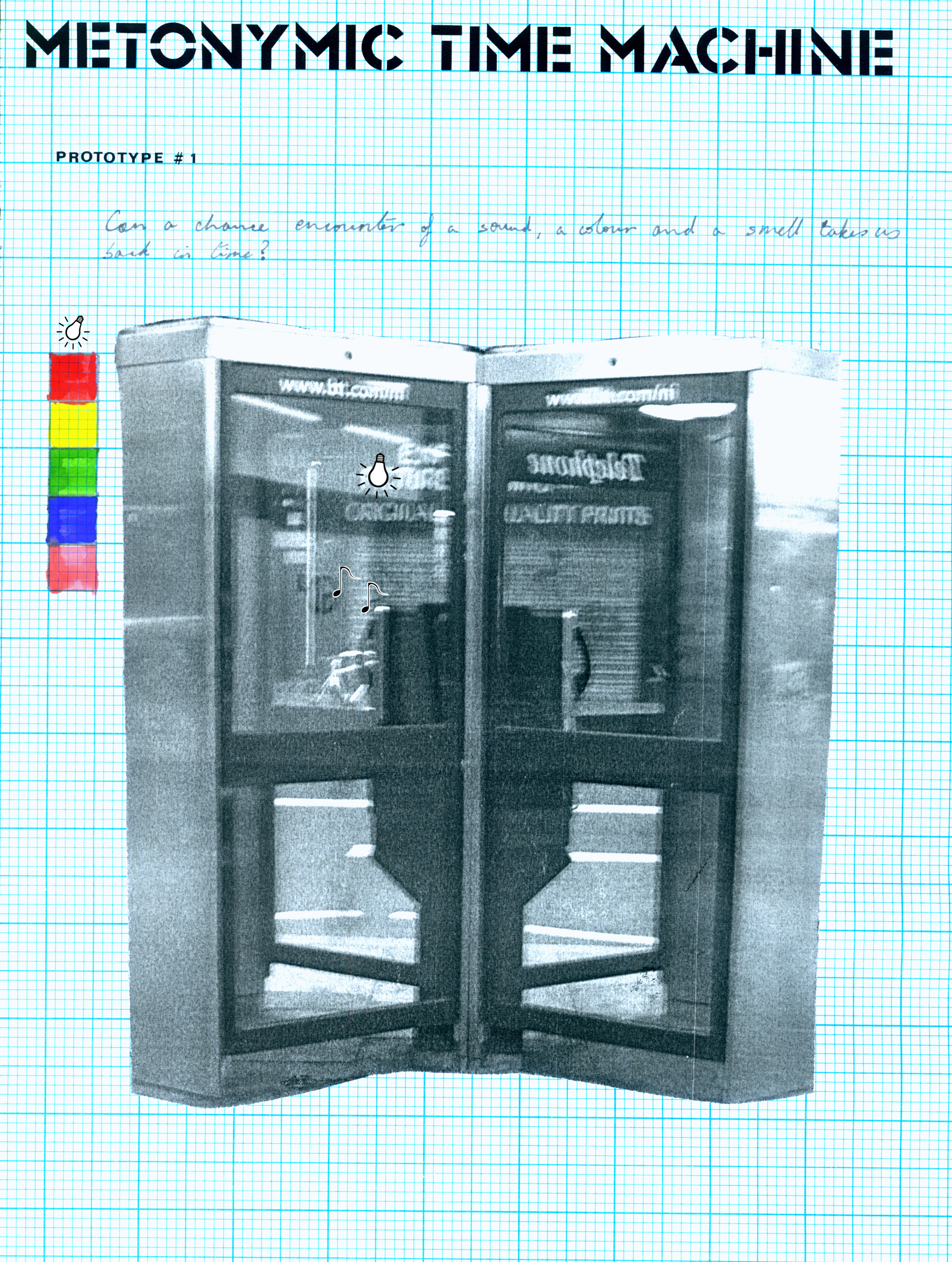 Using a public phone box on Queen Street, Belfast as a testing site I attempted to manipulate it as an initial trial of the time machine, Prototype #1. I called the phone box between 4pm and 5 pm each day of Fix live Art Biennial and invited people to listen to 3 or 4 pre-recorded sounds down the phone and asked them what smells the sounds remind them of. At the same time as this I slowly rotated the colour of the light in the phone box. I hope that by doing these 2 things I offered people the chance to travel back in time in their own minds.